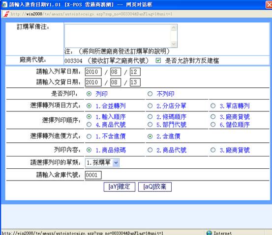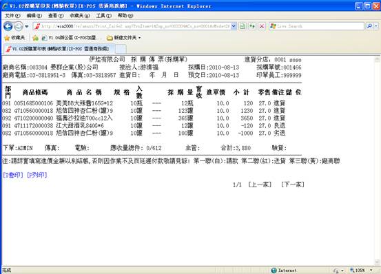 鍵,印轉驗收單:當掃條碼描採購單輸入完成後,啟動印轉功能時,本項目的印轉功能與採購單輸入處理作業中的印轉功能完全一樣,所不同的是這邊的印轉作業功能中,所掃描採購的廠商對像不一定是只有單一廠商,因此系統可以供操作者再顯示選擇目前需要印轉進貨驗收的廠商名單,否則沒選中的廠商代號可以只轉入各該廠商的採購輸入處理檔案中備用。