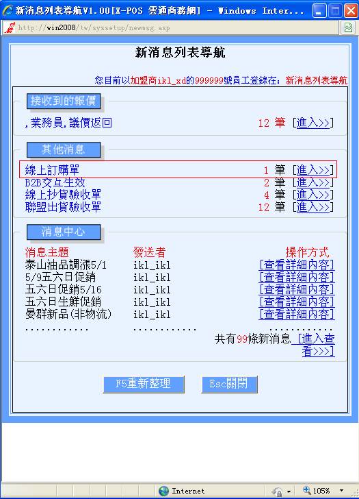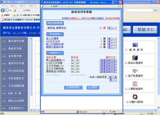 3-2.登錄您剛剛選擇的轉單客戶代號的用戶名進入辦公區進入系統彈出消息嚮導如圖: